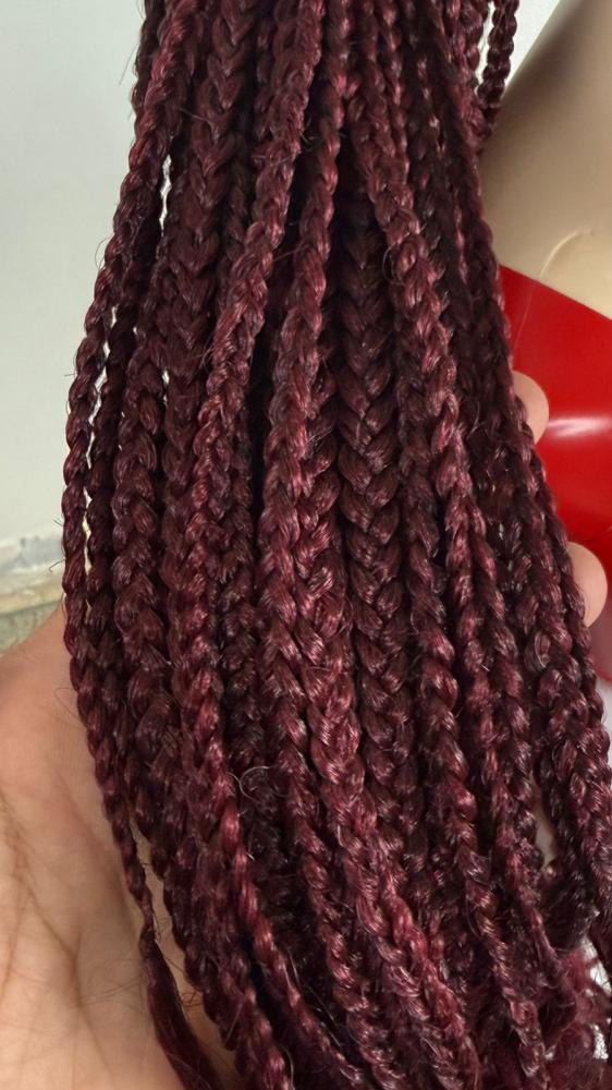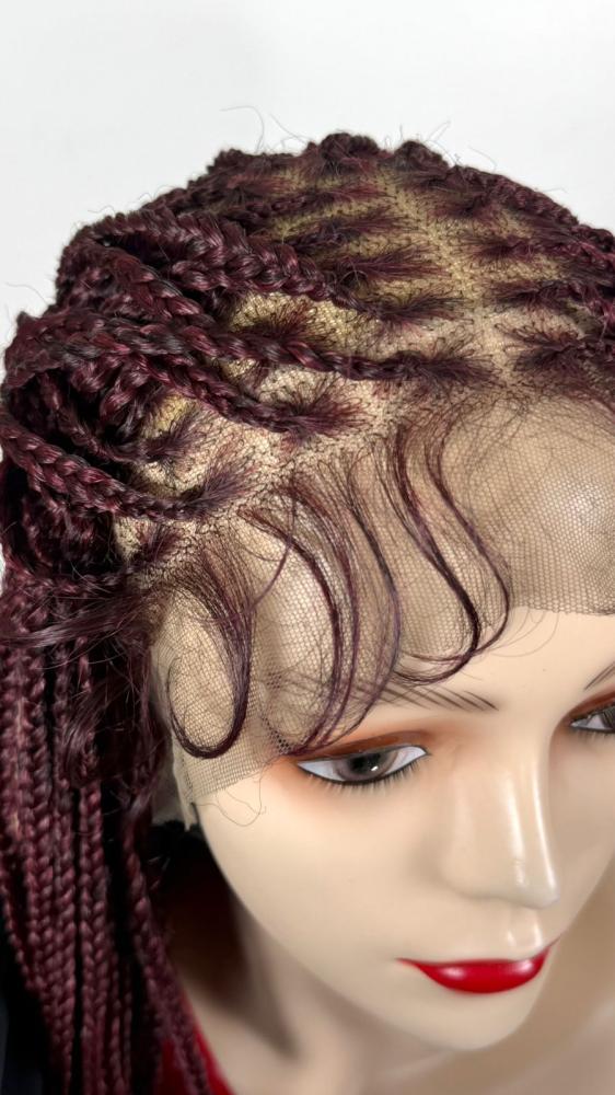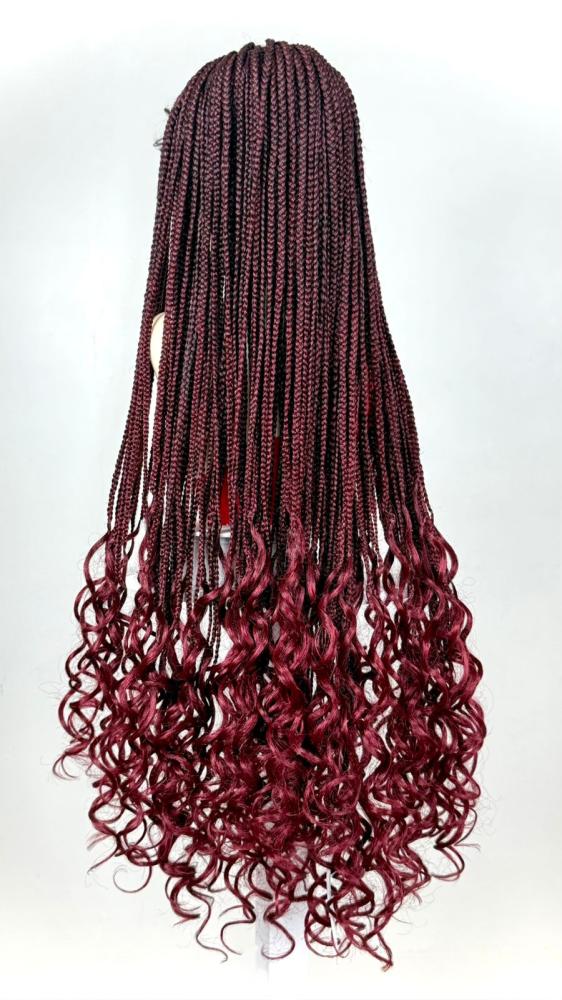 - التصميم واللون: تتميز هذه الباروكة بضفائر افريقية (Box Braids) رفيعة وطويلة تنسدل بأناقة. يضفي عليها اللون العنابي/الأحمر الداكن (Burgundy) جاذبية خاصة. الجزء السفلي منها ينتهي بتدرج كيرلي كثيف وساحر، مما يمنحها مظهرًا مفعمًا بالحيوية والحركة.