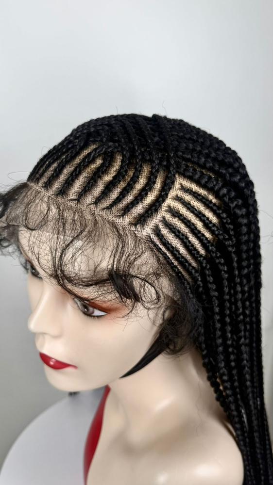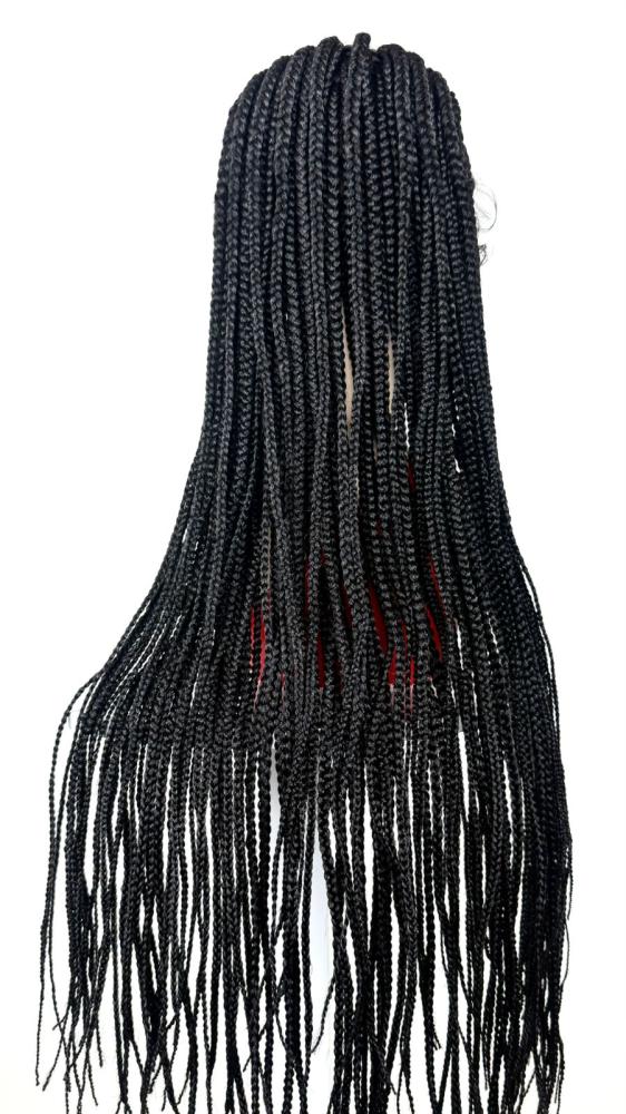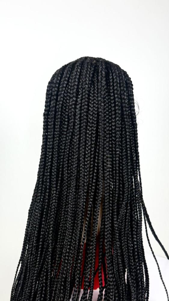اللون والشكل الكلاسيكي: تتميز هذه الباروكة بلون أسود غامق طبيعي يضفي عليكِ مظهراً كلاسيكياً قوياً وجذاباً. النمط هو ضفائر صندوقية (Box Braids) رفيعة وأنيقة تنتهي بـ أطراف مستقيمة ومحكمة، لتضفي عليها مظهراً محدداً ونظيفاً، مثالياً للباحثات عن الأناقة العصرية والعملية.